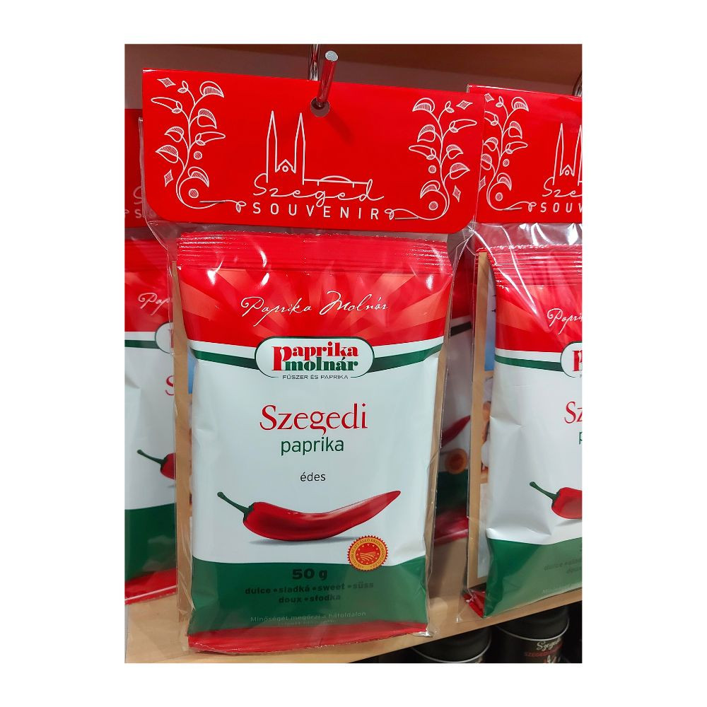 Szegedi fűszerpaprika-termő tájkörzetben termesztett 50 g édes és 50 g csípős fűszerpaprika-őrlemény, aromatartó tasakban, többnyelvű fogyasztói kiszerelésben. Hungarikum és eredetvédett termék, oltalom alatt álló eredetmegjelöléssel és HÍR védjeggyel oltalmazott termék.